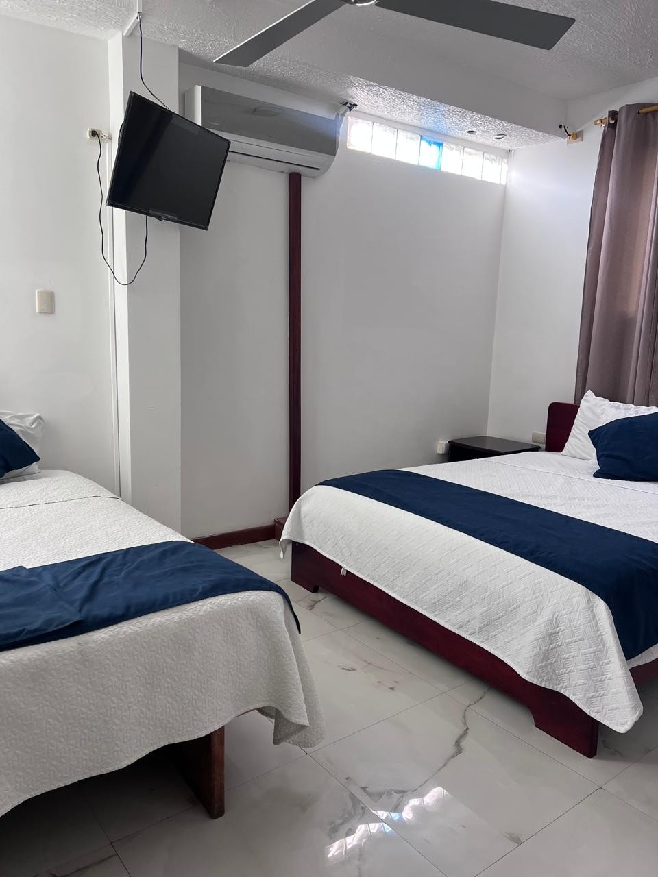 Habitación en segunda planta. La habitación cuenta con 2 camas Queen, aire acondicionado, baño privado con agua caliente y secador de cabello. Disfruta de nuestra piscina luego de tus actividades turísticas. Te brindamos agua filtrada, te y café Galapagueño free 24 horas, disponible cundo lo necesites. Nuestras tarifas no incluyen 15% IVA, por favor si eres de ECUADOR y requieres Factura comunícate con nosotros antes de confirmar tu reserva.