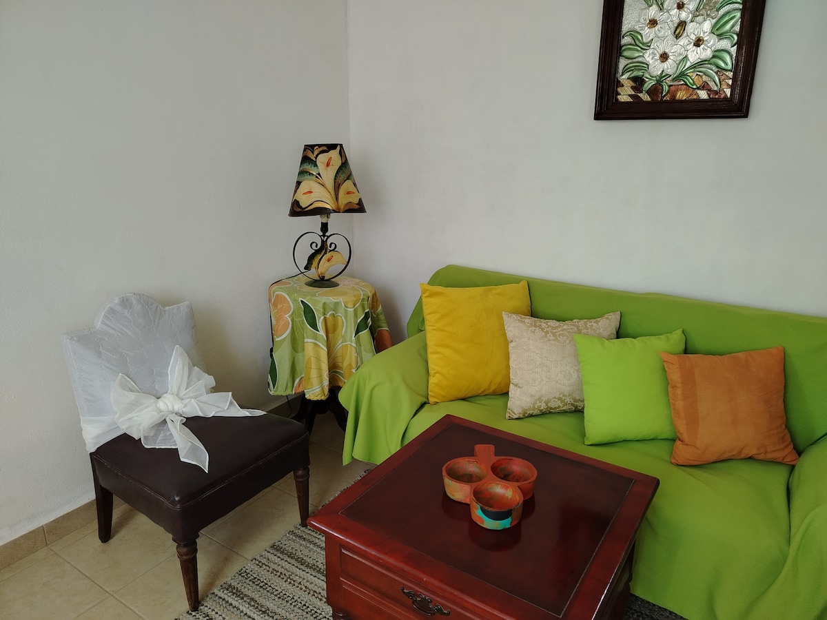 Apartemen cantik untuk 2 orang dengan kamar tidur queen, kamar mandi, ruang tamu, dapur lengkap,A/A dan kipas angin langit - langit. Lokasinya di dalam gedung, berada di lantai nomor 3, memiliki sirkuit tertutup, area umum, layanan laundry mobil (biaya tambahan) dan yang terbaik adalah sudut pandang di lantai atas atau taman Atap, tempat Anda bisa menikmati pemandangan teluk yang indah dan matahari terbenam yang indah.