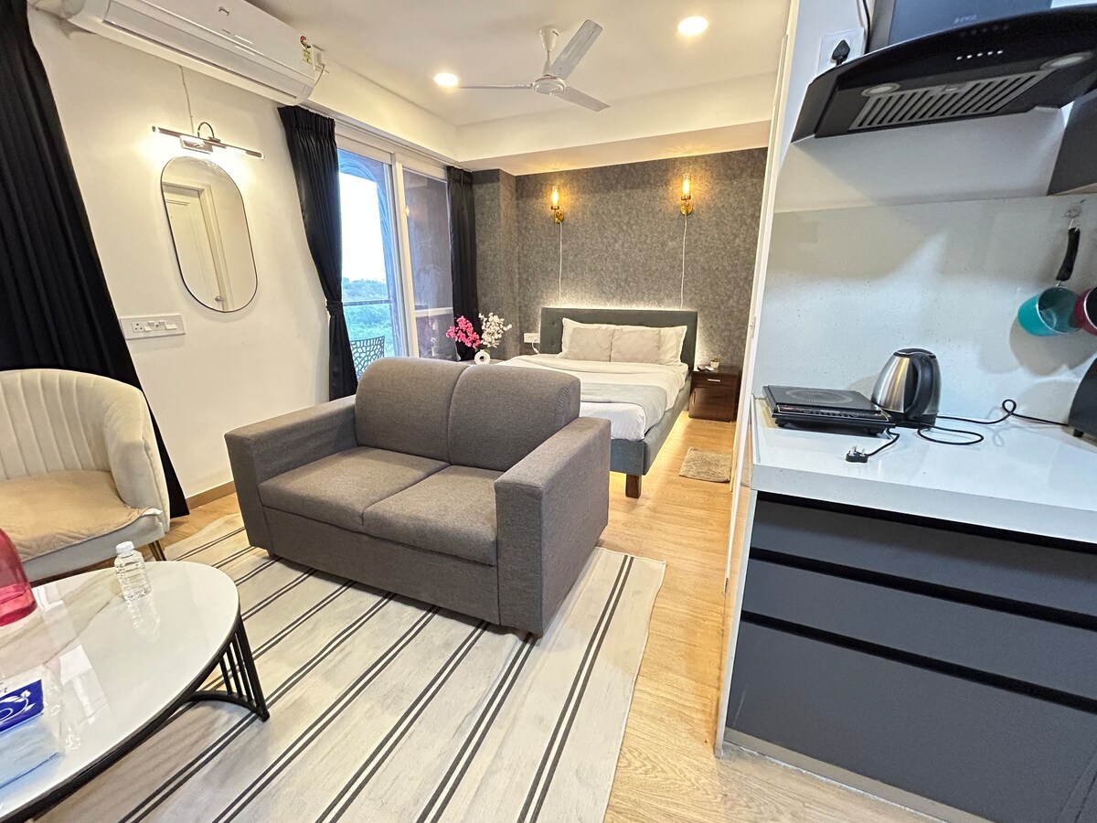 • Ruang Tamu Nyaman: Dekorasi modern dengan tempat tidur queen size mewah, sofa, dan sudut makan. •Dapur lengkap: Sangat cocok untuk memasak makanan atau menikmati kopi pagi. •Fasilitas: Wi - Fi berkecepatan tinggi, TV layar datar, dan AC • Lokasi Utama: Dekat dengan transportasi umum, pusat perbelanjaan, dan kehidupan malam yang semarak. Baik Anda menjelajahi atraksi Pune, menikmati kuliner lokal, atau sekadar bersantai, studio ini memiliki segala yang Anda butuhkan untuk masa inap yang berkesan. Pesan sekarang untuk liburan sempurna Anda!