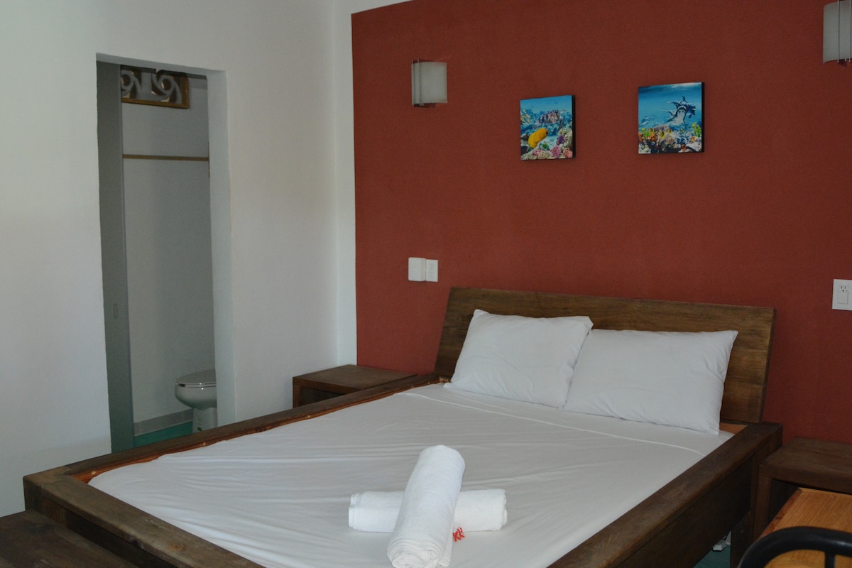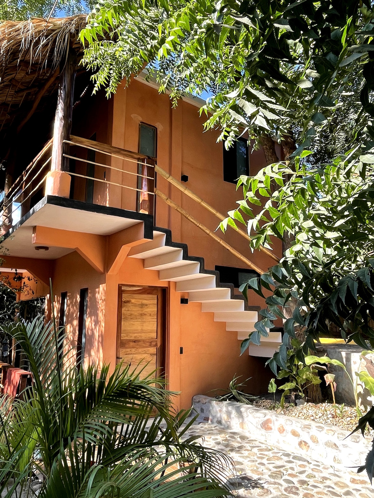 Cabañita ubicada en un segundo nivel con 🚾 privado y 🚿 regadera compartida FUERA DE LA HABITACION, con vistas al jardín, cama matrimonial con mosquitero, wi-fi Starlink gratis, ventilador, caja de seguridad y un esmerado servicio de limpieza diario. Posada México - Hotel, Restaurante, Pizzería & Bar Ubicada en primera línea de playa.