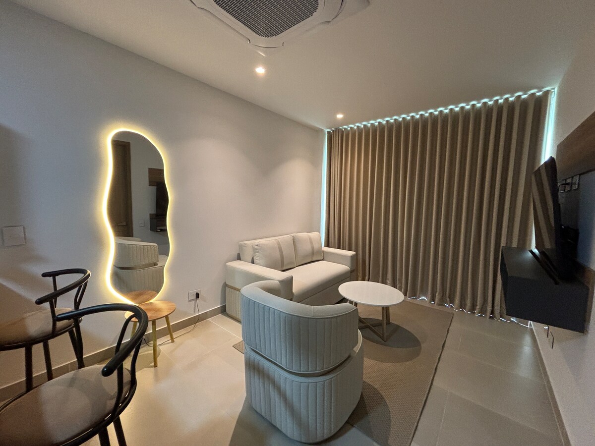 This beautiful beachfront loft is located in the Morros Zoe condominium, Serena del Mar — The Dream City — one of Cartagena’s newest and most exclusive areas. "Direct Access to the Private Beach" "Exclusive resort with magnificent spaces to relax and enjoy" "Professional cleaning and disinfection" • 10 minutes from Rafael Nuñez International Airport • 15 minutes from the Historic Walled City • 3 minutes from Las Ramblas Shopping Plaza