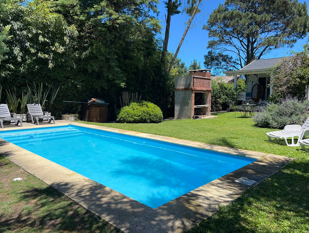A 3 cuadras de la playa , zona cerca .de todo La casa es amplia , practica y tiene todo para unas increíbles vacaciones . Completa para 8 personas , gran parque , piscina climatizada- 2 suites más 2 dormitorios con camas individuales . Baños Impecable todo ropa de cama , toallas , reposeras. Espacios amplios disfrutando de estares y Terrazas al jardín con sillones , hamacas , todo acompañado de un encantador y cuidado entorno verde y con una hermosa piscina climatizada y reposeras. Confort