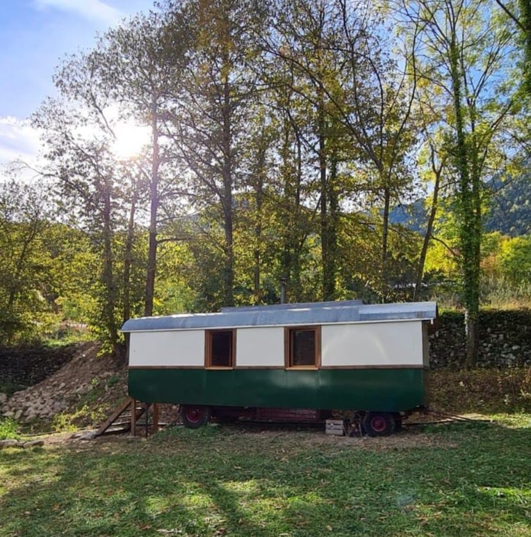 Une roulotte des années 30, qui après de longs voyages a trouvé sa place dans une vallée pyrénéenne très préservée. Un habitat atypique, plein de charme et d'histoires de voyages, vous y apprécierez le calme et l'emplacement à l'ombre des châtaigniers.
