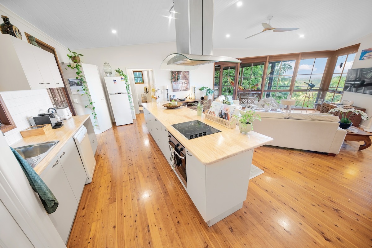RUMAH HUTAN BELANTARA Tempat peristirahatan yang menakjubkan ini terletak di atas bukit, bersebelahan dengan hutan negara bagian dan taman pribadi. Menawarkan pemandangan 180 derajat yang menakjubkan ke arah Mt Coolum, Mt Ninderry, Mt Cooroy, dan Samudra Pasifik. Nikmati alam liar, kedamaian, dan privasi mutlak, perasaan bahwa Anda berada sejuta mil dari mana saja, namun hanya 5 menit berkendara singkat ke kota Yandina yang unik dan 20 menit ke Coolum, rumah liburan ini menjanjikan pengalaman hinterland terbaik Anda.
