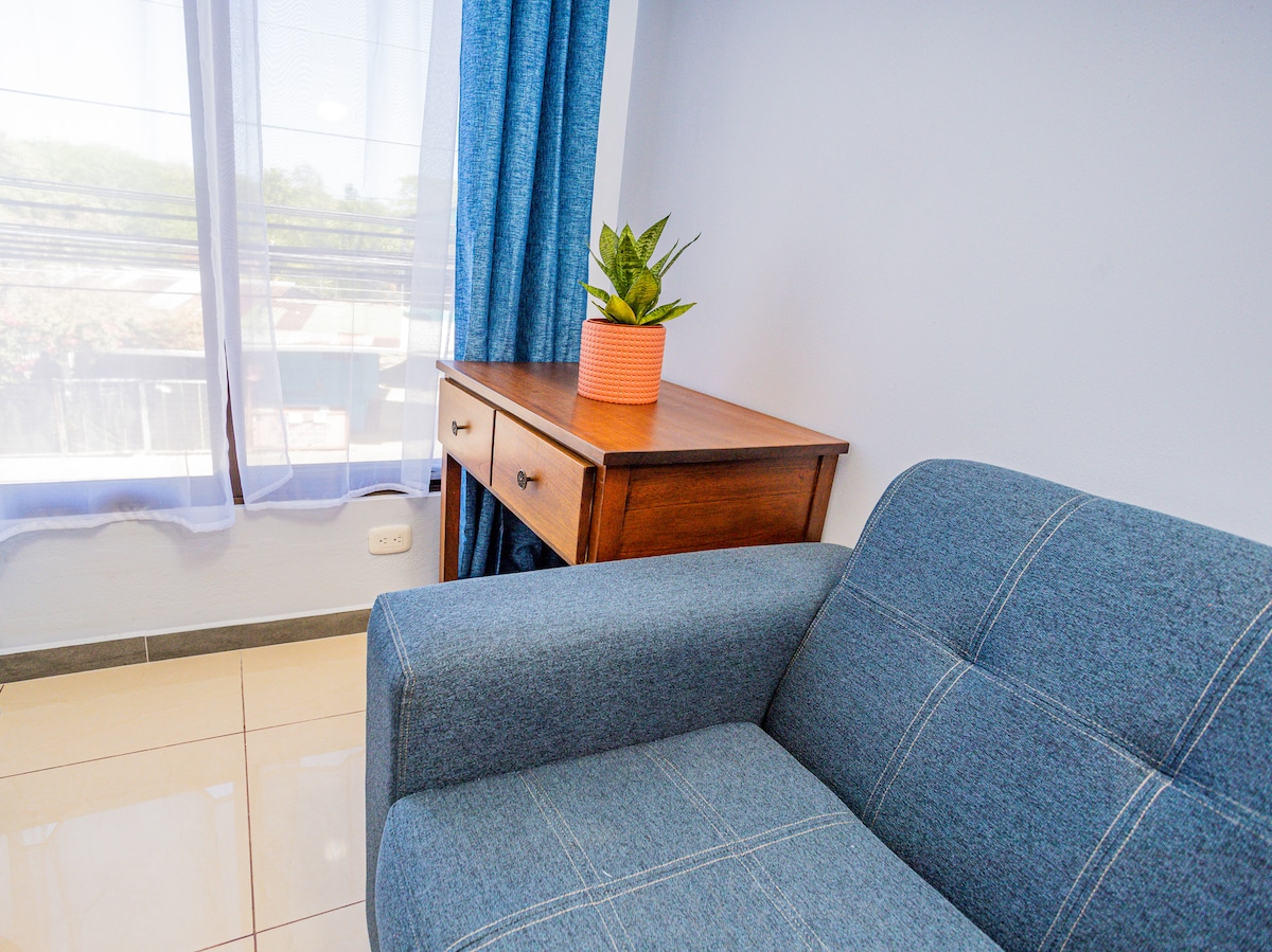 Ini adalah apartemen pribadi dan bukan hanya kamar. Tempat ini memiliki dapur, kamar mandi lengkap, ruang tamu/area makan, 1 kamar tidur, AC, TV, WiFi, dan kolam renang bersama. Ada tempat tidur berukuran queen dan kami menambahkan tempat tidur single dengan biaya tambahan untuk tamu ketiga. Jika apartemen ini dipesan, lihat tempat kami di Casa Pargo, kami memiliki 6 unit yang sangat nyaman. Dikelilingi oleh alam dan pemandangan indah.