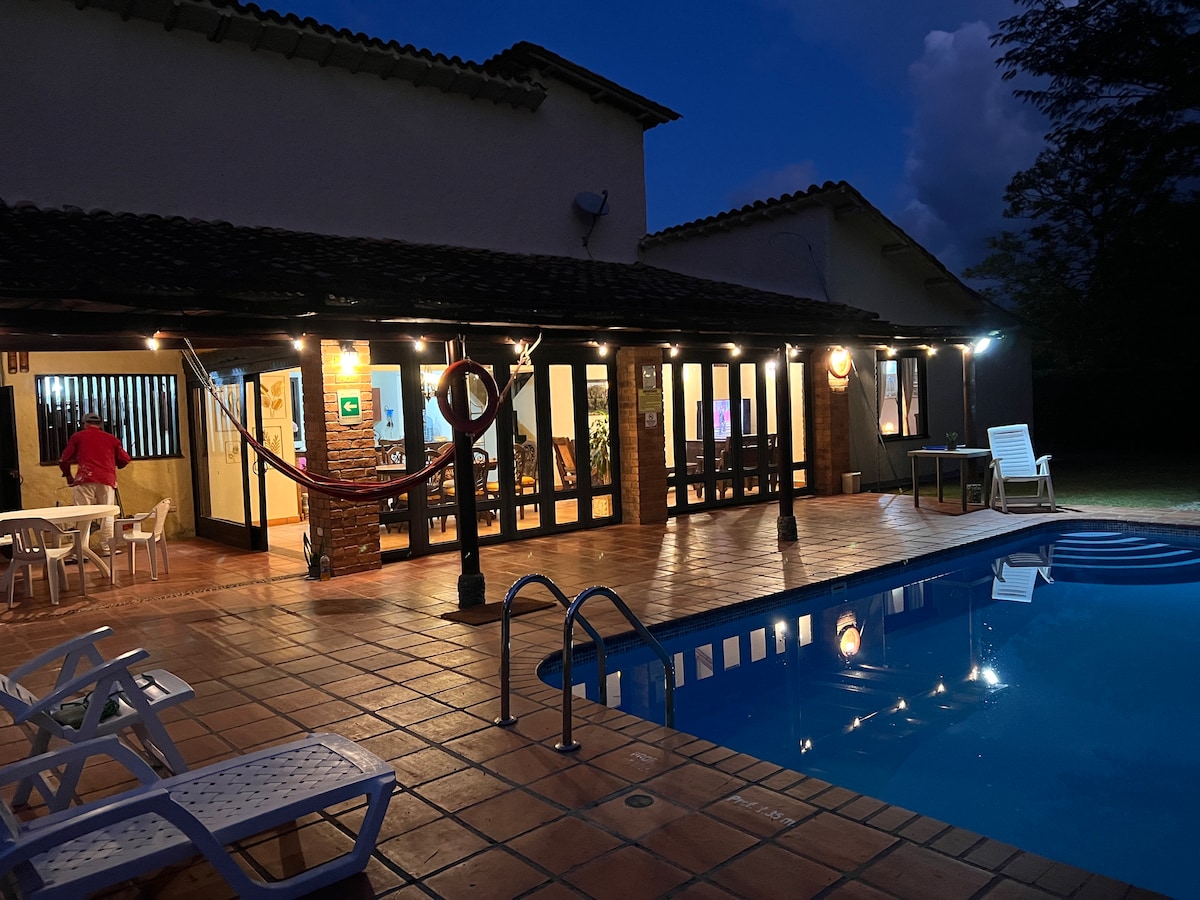 Rural and private setting, not shared with other guests. Located on the Montenegro–Quimbaya road, Km 3. Beautiful house, equidistant from Panaca (16 km), Parque del Café (13 km), and Los Arrieros (1.5 km). Exclusive rental: 5 to 17 guests. Great weather, fresh air, views, pool, cool house, wide halls, hammocks, gardens. BBQ, full kitchen, grill barrel, ping pong table. El Edén Airport: 30 km. THE ROAD HAS 600 UNPAVED METERS UNTIL YOU REACH THE FARM.