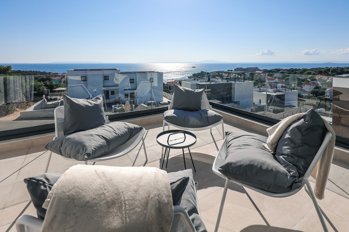 Vila ini dikelilingi pepohonan hijau dan menawarkan pemandangan Laut Adriatik yang menakjubkan. Kolam renang seluas 50 m² ini dipenuhi air garam. Di lantai dasar memiliki dapur lengkap, ruang tamu dan dua kamar tidur dengan kamar mandi. Ruang tamu mengarah ke teras yang indah. Ada pula dapur musim panas dan area barbekyu. Kamar tidur dengan kamar mandi, sauna, dan ruang ganti berada di lantai pertama. Tempat ini juga memiliki galeri dengan mesin olahraga dan sepak bola meja. Vila ini menawarkan dua ruang garasi.
