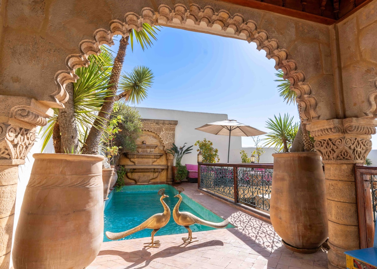 Suite dengan ruang tamu ganda dan tiga tempat tidur termasuk kanopi besar di rumah tradisional dengan pintu raksasa dan langit-langit cedar dan dua tempat tidur kecil untuk 1 orang. Dinding dihiasi dengan zelliges dan dekorasi Maroko yang apik. Sarapan ekstra. Sarapan (segar dan buatan sendiri) tidak termasuk dalam harga kamar, yaitu 8 euro per orang per malam. Sarapan di rumah tidak termasuk dalam harga kamar, harganya adalah harga tambahan sebesar 8 euro per orang.