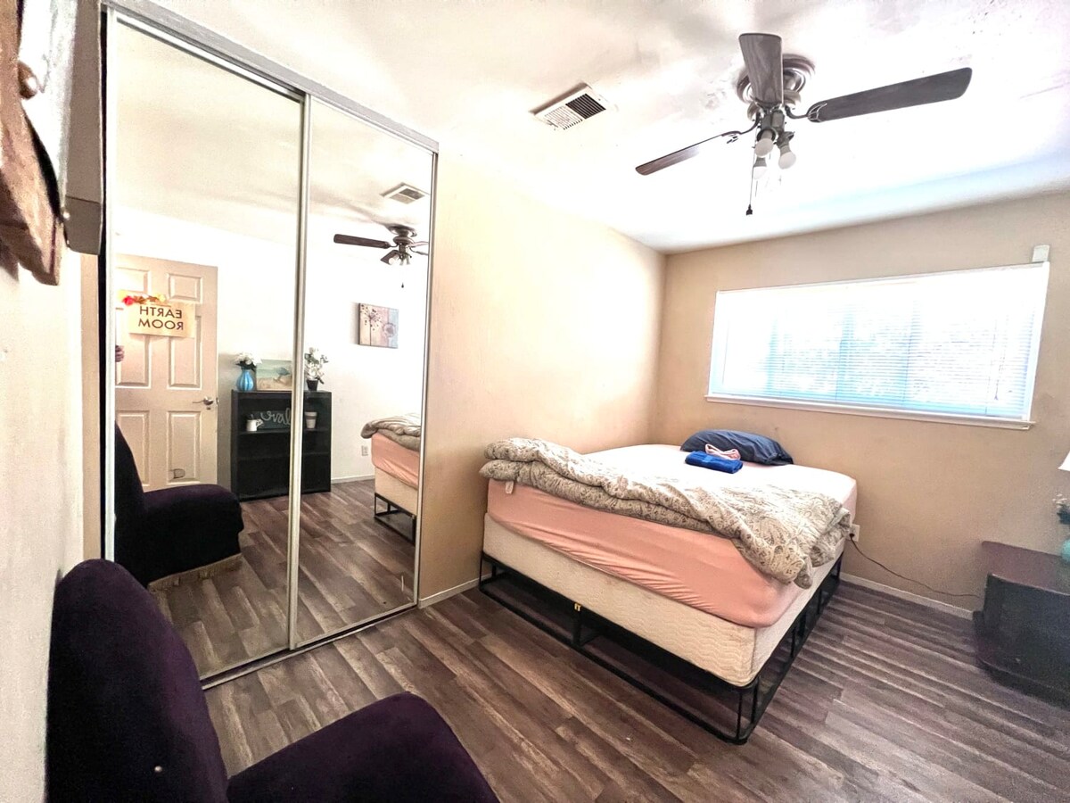 Suite tamu menempel ke rumah utama dengan pintu masuk terpisah. Pintu Prancis terbuka ke teras besar. Pintu masuk dan ruang tamu yang terang. Dapur kecil termasuk kulkas, kompor induksi portabel listrik listrik, microwave, wajan, peralatan makan, dan peralatan makan. Seluruh sistem penyaringan air rumah. Kamar mandi besar dengan pancuran walk - in. Kasur udara jika diperlukan untuk tamu tambahan. Halaman belakang yang luas cocok untuk anjing. Sepuluh menit ke Ibukota Negara Bagian, CSUS, dan lima menit ke UC Davis Medical Center.