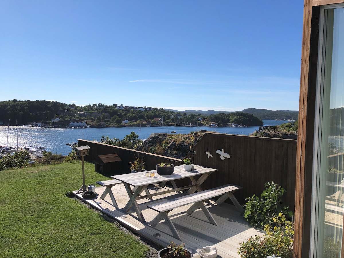 Selamat datang di rumah kami yang indah, sangat cocok untuk mereka yang menginginkan keindahan pemandangan dan pengalaman Norwegia yang nyata! Rumah ini berlokasi tepat di tepi perairan, dikelilingi pegunungan dan alam yang subur. Di sini Anda bisa menikmati kopi pagi hari sambil melihat pemandangan fjord. Akses langsung ke laut – cocok untuk berenang, memancing, atau naik perahu kecil. Pengisi daya EV: 2,3kW - outlet tipe 2 (bawa kabel Anda sendiri) Søgne 15 menit. Kristiansand 24 menit Kristiansand Dyrepark 35 menit. Mandal 22 menit Perahu 15 kaki dengan motor 6hp tersedia di musim panas.