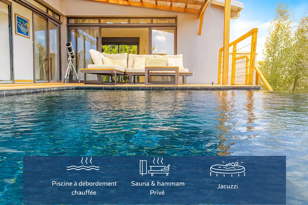 Selamat datang di Villa Louane (100m2), bertengger di puncak Saint-Pierre, 135m di atas permukaan laut, ideal untuk masa inap yang menenangkan dengan pemandangan laut dan kota Saint-Pierre yang menakjubkan. Sewa ini menggabungkan ketenangan dan panorama yang luar biasa. ● Kapasitas hingga 5 orang ● Kolam renang infinity, sangat cocok untuk bersantai sambil menyaksikan matahari terbenam. Shower luar ruangan ● Teras berlantai kayu, sekitar 50 m2, dengan kios untuk minum aperitif dan mengagumi pemandangan