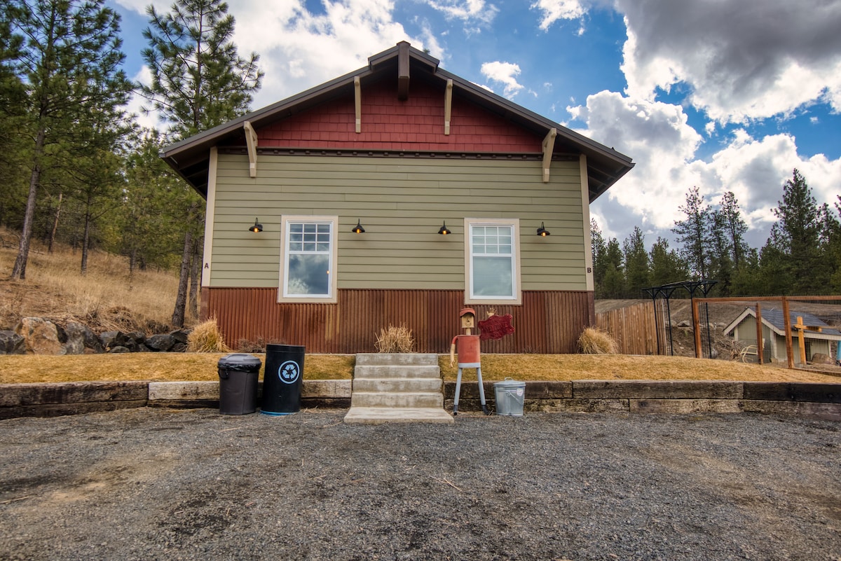 Pintu masuk terpisah ke suite yang baru dibangun. Pinggiran kota di depan; hiking di pepohonan dan anak sungai di belakang. Area teras langsung di luar. Di dalamnya, tempat tidur king, dapur kecil (tanpa kompor), area TV (You Tube TV, olahraga, dan banyak pilihan lainnya) dengan dua penopang putar. Kamar mandi dengan pancuran termasuk mesin cuci - pengering. Wi - Fi dan tersedia kopi/teh dan camilan. Bersantai di dalam atau di luar. Dekat dengan North Spokane: 10 menit dari Whitworth dan Green Bluff, 6 menit dari Starbucks, 5 menit dari Costco & 3 menit dari makanan cepat saji.