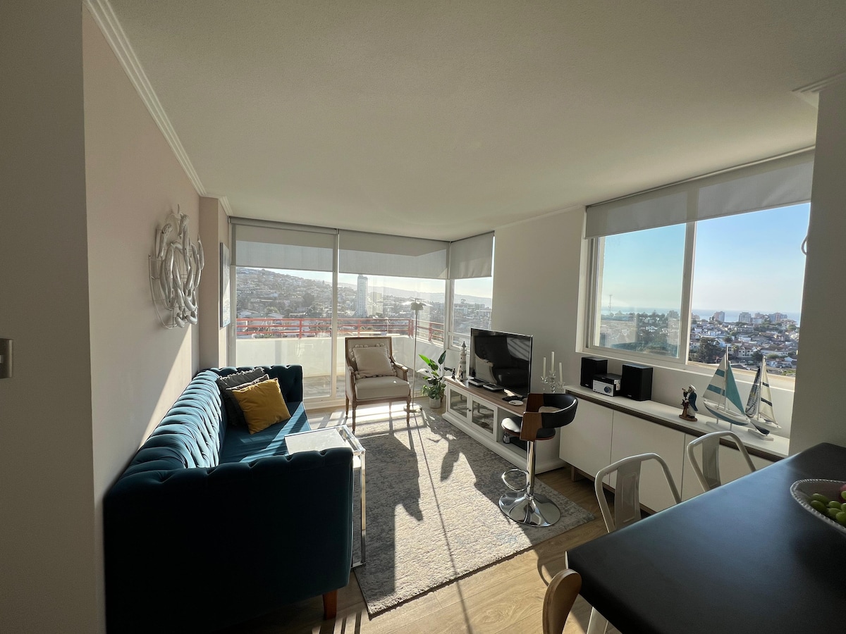 Bersantai di liburan yang unik dan damai ini. Apartemen dengan pemandangan laut yang luar biasa rapi (pemandangan dari Valparaiso ke Concón). Apartemen baru yang indah terletak di lingkungan tinggal 2 Tempat Tidur, 2 kamar mandi, teras dan dapur kecil. Lingkungan tinggal yang tenang dan pemukiman Fiber Optic wifi Equipped Kitchen (Simetris 500 mbps) Parkir bawah tanah Termasuk seprai dan handuk untuk 4 tamu TV 42 "di ruang keluarga dengan Roku Bangunan dengan kolam renang Jika Anda memiliki pengunjung, harap berkoordinasi