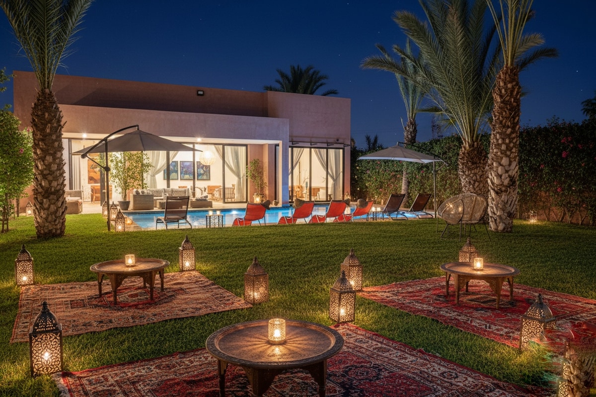 Escape to our serene 7-bedroom, 8-bed villa in Marrakech, a peaceful haven for unforgettable stays. With spacious interiors, lush gardens, and a jacuzzi, it’s ideal for family retreats, birthday celebrations, intimate elopements, or corporate gatherings. Full staff is dedicated to providing comfort and luxury throughout your stay. To make your experience seamless, our trusted partner company can organize tailored events, ensuring every moment is unique, memorable, and stress-free.