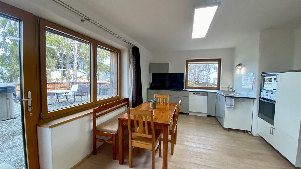 Tidur nyenyak, udara segar, dan pemandangan menakjubkan. 90 meter persegi, di lantai atas, 1 kamar tidur, 1 kamar mandi dengan pemanas di bawah lantai, dapur terbuka dengan ruang tamu dan ruang makan, ruang kebugaran/kesehatan dengan kabin inframerah, ramah alergi, balkon besar dengan pemandangan Zugspitz yang megah, tempat parkir mobil di rumah, Wi - Fi, TV layar datar, seprai + handuk, pengering rambut, sabun harian, hunian 1 -2 orang. Lingkungan tinggal ini tidak mengizinkan hewan peliharaan.