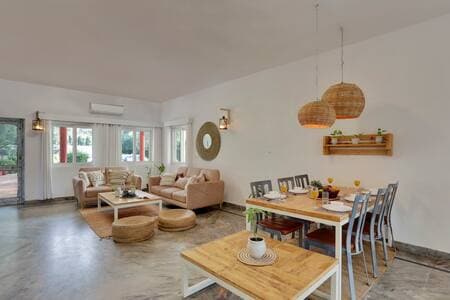 Looking for the ultimate getaway with your gang? Say hello to Manvi Estate, Gurgaon’s hidden gem for big groups. This fabulous villa in Gurgaon is all about vibes, with four villa units, each uniquely coloured inside and out, adding a splash of personality to your stay. The villa boasts a sprawling lawn perfect for games or lazy strolls, and a massive swimming pool for endless fun. Inside, the inviting living room, dedicated dining space, and 10 cosy bedrooms make it feel like home, but better.