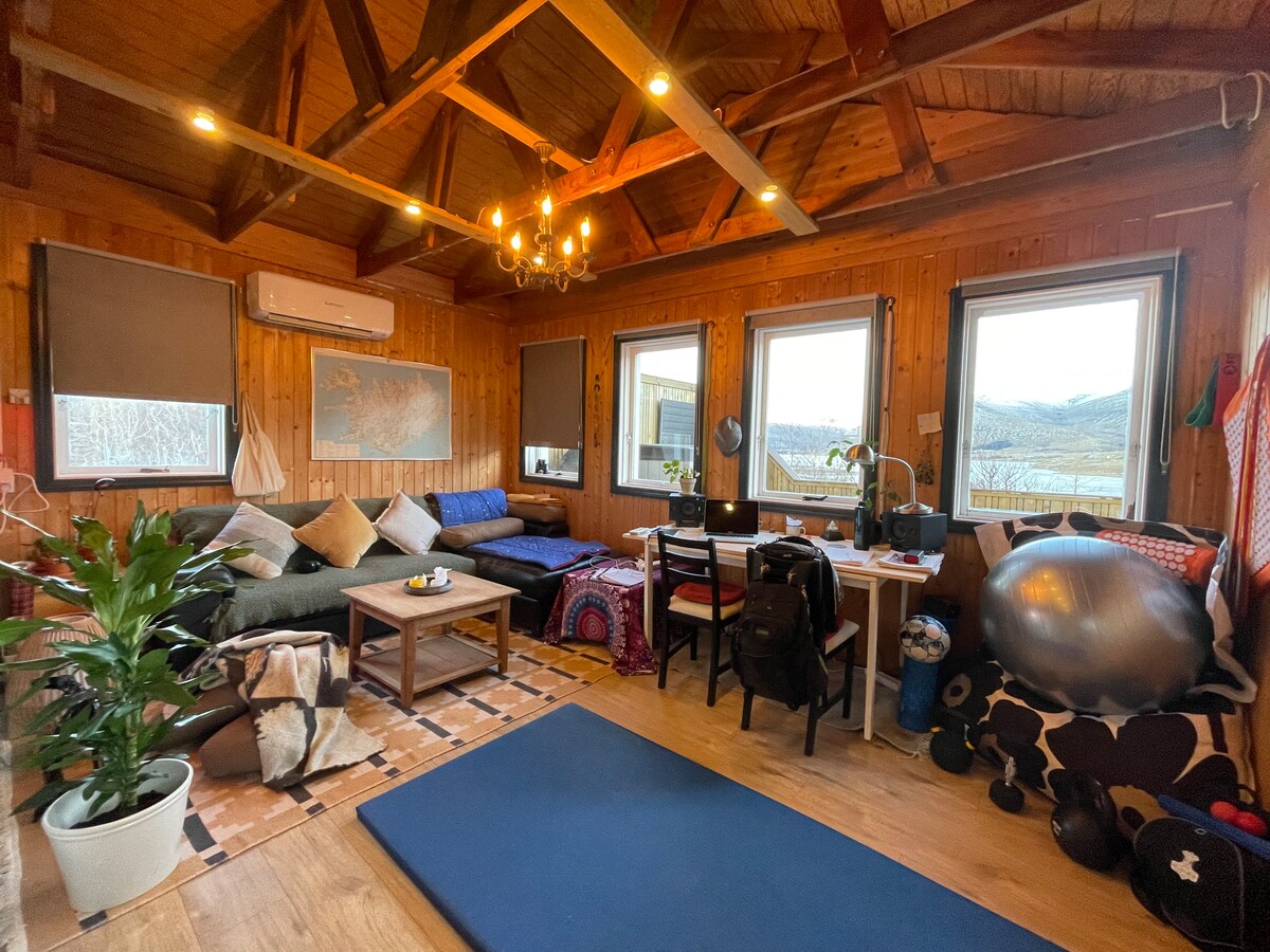 Rumah kabin dengan pemandangan, cahaya utara, bak mandi air panas.