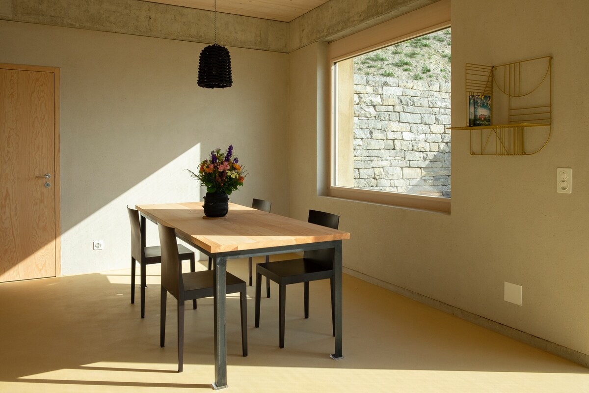 Di tengah - tengah lanskap budaya dari jenis khusus berdiri guesthouse la Fourmi, di lokasi perumahan yang menarik dan tenang di lereng selatan Vully. Pemandangan panorama Danau Murten, tanaman merambat dan Pegunungan Alpen dengan akses ke area tamannya sendiri. Akses ke rumah mengarah melalui tangga ke halaman dengan air mancur kecil. Guest house direalisasikan dengan sangat menghormati alam dan dengan penggunaan sumber daya yang cermat. Kerajinan dan langit - langit kayu memastikan iklim yang baik