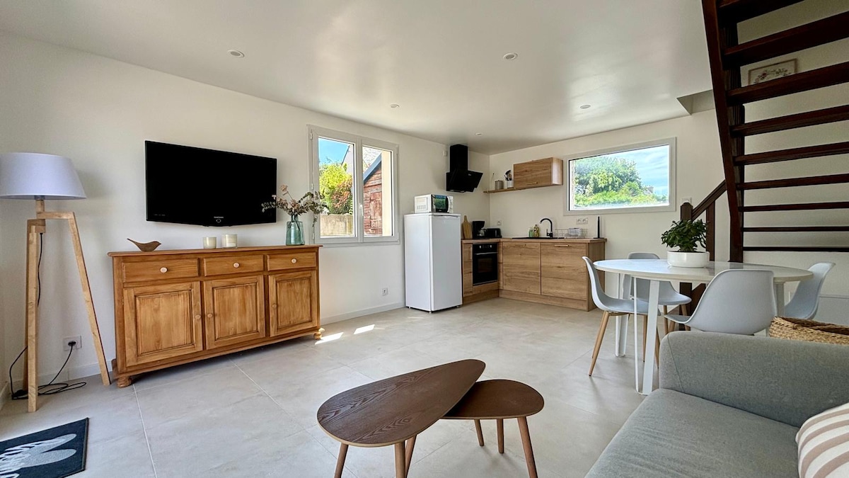 Bersantai di studio baru dan nyaman ini, tenang namun dekat dengan fasilitas. Saat Anda tiba, Anda akan menemukan dapur fungsional yang bagus dan area duduk kecil yang nyaman. Juga di lantai dasar, kamar mandi kecil dengan mesin cuci. Di mezzanine, Anda akan menemukan tempat tidur double yang bagus. Di luar, teras kecil akan menyambut Anda dengan pemandangan taman besar yang indah tempat hewan bermain: llama, domba, kambing, dll. Untuk berjalan-jalan, jalur pantai menanti Anda berjarak 300 m dengan berjalan kaki!