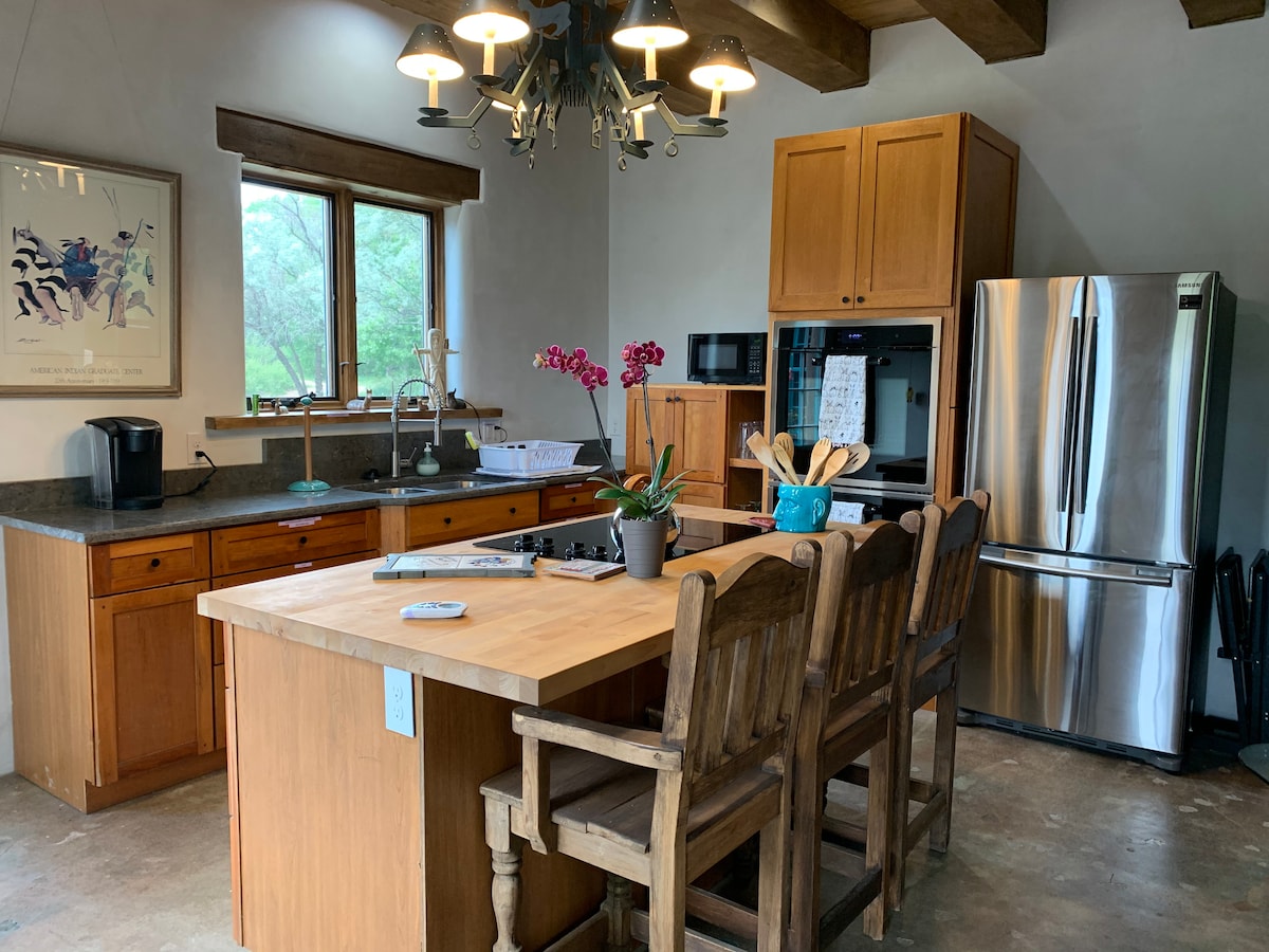 Artist Rod Goebel crafted this peaceful sanctuary-a residence, chapel, screened-in patio & guesthouse, on a stunning six acre beauty, fully fenced rural retreat. Enjoy a covered patio, grill. hot tub and partial kitchen with all the essentials. Just 12 mins from town, near Taos Ski Valley road. Pet friendly, sacred & private, our property was named the top Airbnb in Taos for 2025- "Only in New Mexico" online. Come unwind with art, nature's splendor and true relaxation, under starry skies.