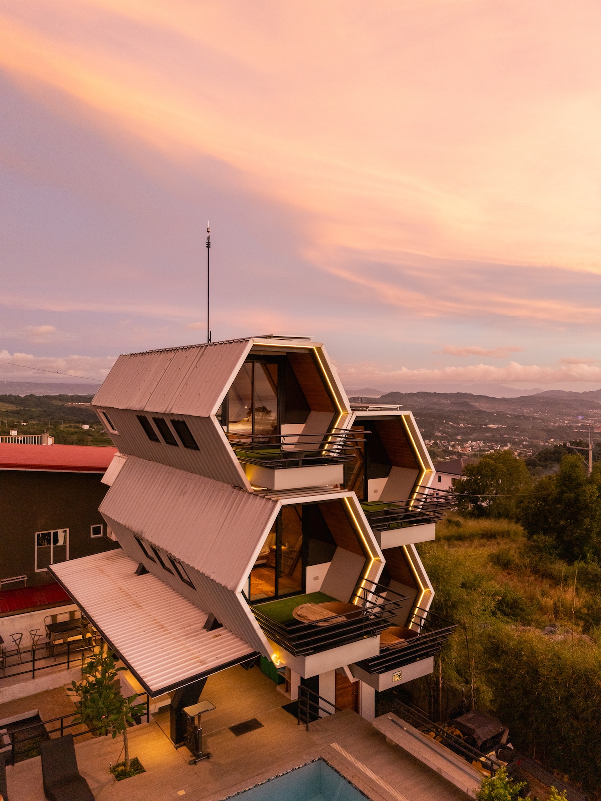 Staycation ini memiliki pemandangan pegunungan di jantung kota. Properti unik yang menggabungkan matahari terbenam dan fasilitas kelas atas seperti kolam renang kaca, bak mandi air panas, balkon besar dengan pemanggang untuk keluarga dan teman. Pagi yang damai, sore yang menyenangkan, kumpul - kumpul di malam hari menanti. Tempat ini memiliki lokasi luar biasa dengan akses cepat ke jalur sepeda, restoran, mal, dan banyak lagi. Juga direkomendasikan untuk persiapan pernikahan dan pemotretan. Ada dua Gereja yang dikenal di dekatnya.( St Pedro Calungsod dan Immaculate Heart of Mary )