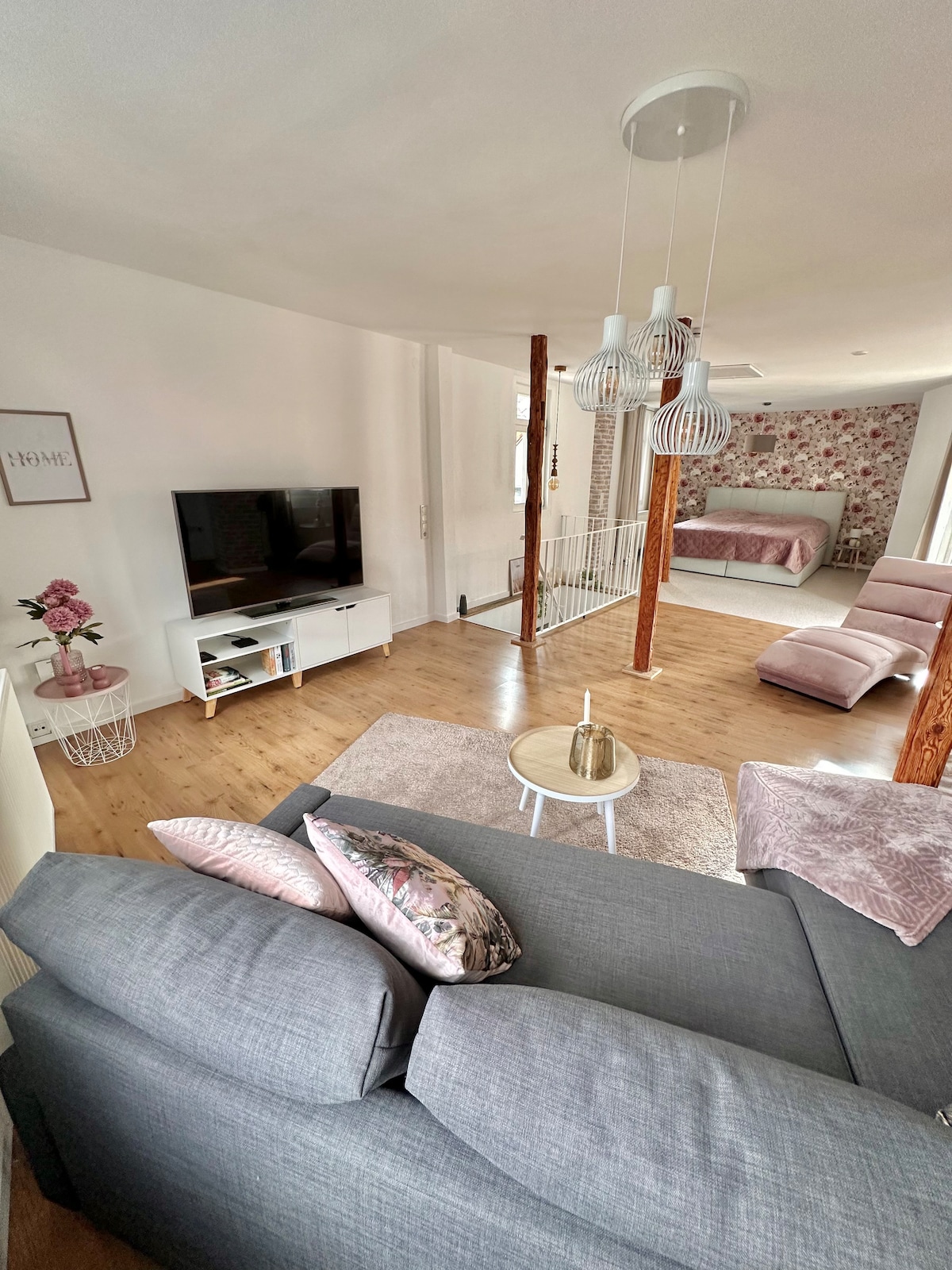 Dipisahkan oleh halaman dari rumah utama, apartemen ini terdiri dari 3 lantai di lumbung yang dialihfungsikan. Di lantai tengah ada kamar mandi dan sudut dapur dan satu tempat tidur queen size box spring. Galeri dengan tempat tidur double dapat dijangkau melalui tangga yang curam. Area pintu masuk (lantai bawah) terletak dengan bagian depan kaca menghadap halaman. Kamar mandi, dapur dan galeri memiliki jendela ke taman. 6 menit berjalan kaki ke S - Bahn ke Frankfurt (sekitar 30 menit ke kota), koneksi yang baik ke A3. Z.Zt. 2G!