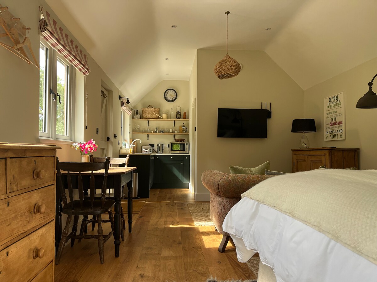 A self-contained, first floor barn room in our peaceful cottage garden. Off-road parking. Double bed, ensuite, a small kitchen & living area give plenty of space to relax & enjoy the views. Continental breakfast items included. Podpoint EV charger. One hour from London by road & train, between Petersfield & Sth Harting & ideally situated for events @ the Tithe Barn, Goodwood, Cowdray & for walkers or ferries. Longer term lets available.