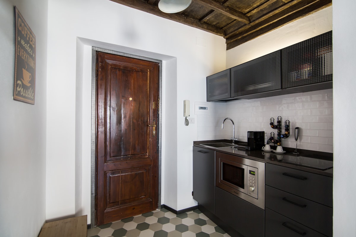 Apartemen Loft yang mewah dan super - chic ini adalah salah satu lingkungan ruang terbuka yang besar dengan Kamar Mandi Pribadi kecil yang menawan dan Dapur Chef Pribadi. Tempat ini memiliki batu bata yang terbuka dan salah satu dindingnya masih memiliki Fresco abad ke -18 yang asli. Aula masuk besar di mana Loteng diakses bersama dengan dua unit sewa lainnya, namun Loteng tetap benar - benar independen dan pribadi: Semua yang Anda lihat di foto yang Anda miliki sendiri. Ikuti kami di #EsquilineSuites