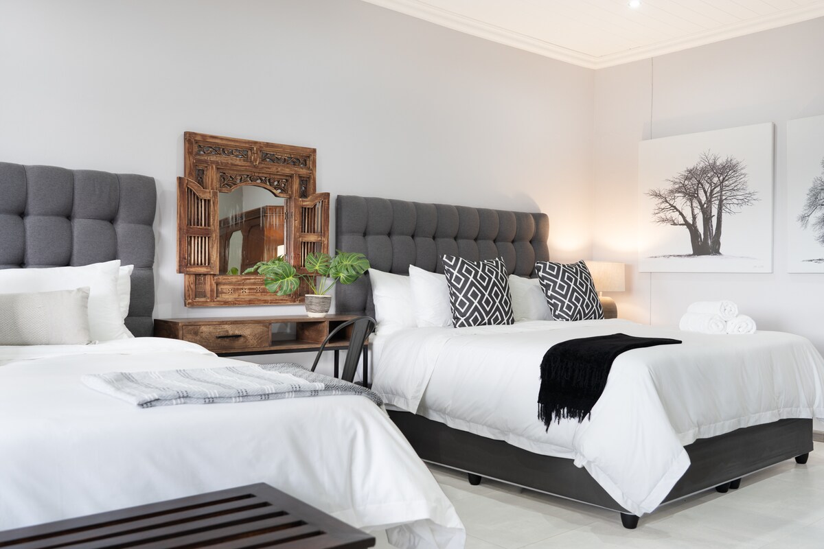 Sangat cocok untuk 2 orang, kamar ber - AC ini memiliki tempat tidur queen size dan kamar mandi di dalam dengan shower dan toilet. TV dengan DStv terpilih, tempat duduk dan akses Wi - Fi tersedia di setiap kamar. Kulkas dan microwave juga tersedia. Untuk kenyamanan, handuk dan seprai disediakan.