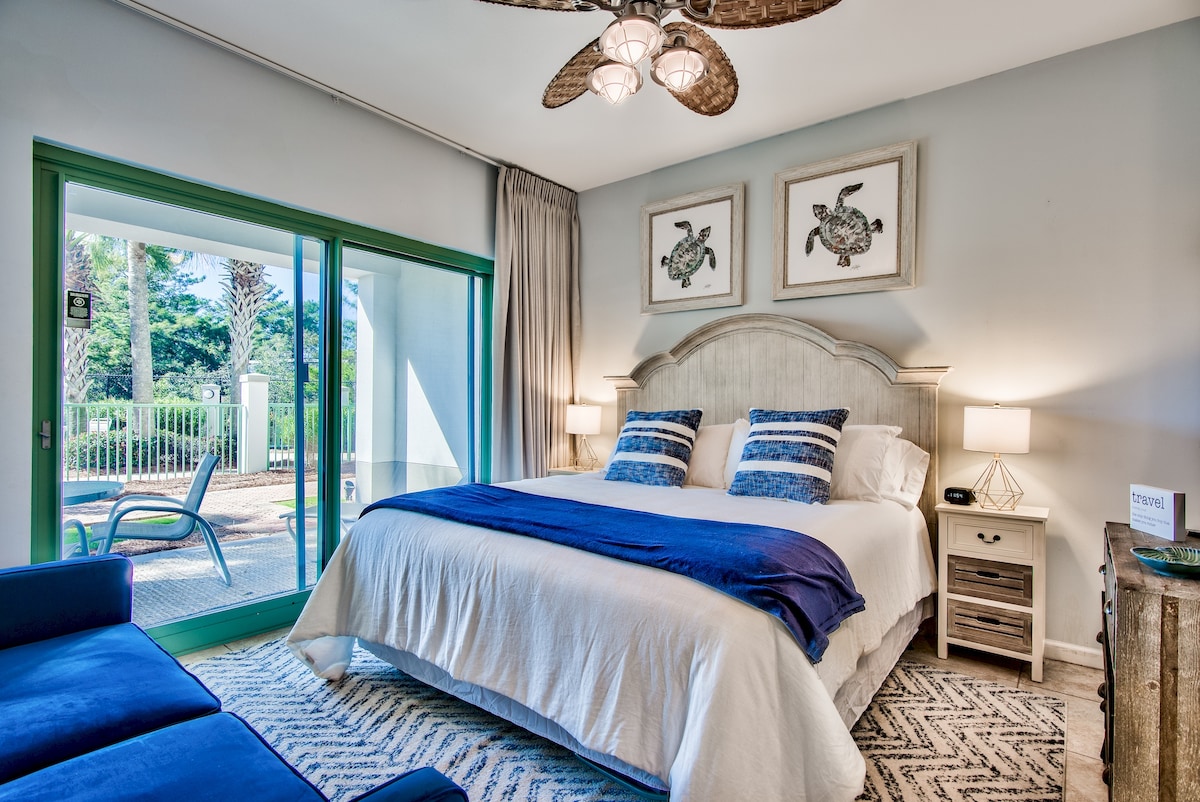 LOKASI yang luar biasa! Kondominium Seacrest Beach 1 kamar tidur kami di tepi kolam renang terletak hanya satu blok jauhnya dari toko & restoran hebat di Rosemary Beach & Alys Beach. Ruang kami cocok untuk pasangan atau keluarga kecil + bayi. (maksimal 2 orang dewasa) Diperbarui dan dinilai tinggi! Nikmati tempat tidur king & sofa bed baru (untuk anak - anak saja), tempat tidur bayi mini (atas permintaan) + perlengkapan bayi. Kondominium seluas 620 kaki persegi kami memiliki area tamu & makan, dapur dengan kulkas lengkap, dan mesin cuci piring. Nikmati balkon pribadi menghadap kolam renang!