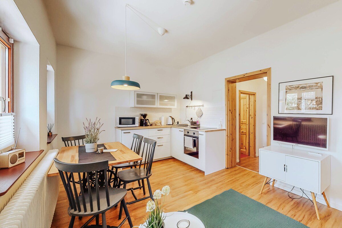 Villa Ostseenordstern terletak di jantung resor Laut Baltik Warnemünde, di lokasi yang tenang namun sentral. Tempat ini direnovasi sepenuhnya pada tahun 2019/2020. Apartemen atau studio berperabot bergaya untuk 2 hingga 4 orang menanti Anda. Apartemen seluas 36 m² terang di lantai satu memiliki ruang tamu yang luas dengan dapur lengkap, kamar tidur menghadap taman dan kamar mandi modern dengan shower yang luas.