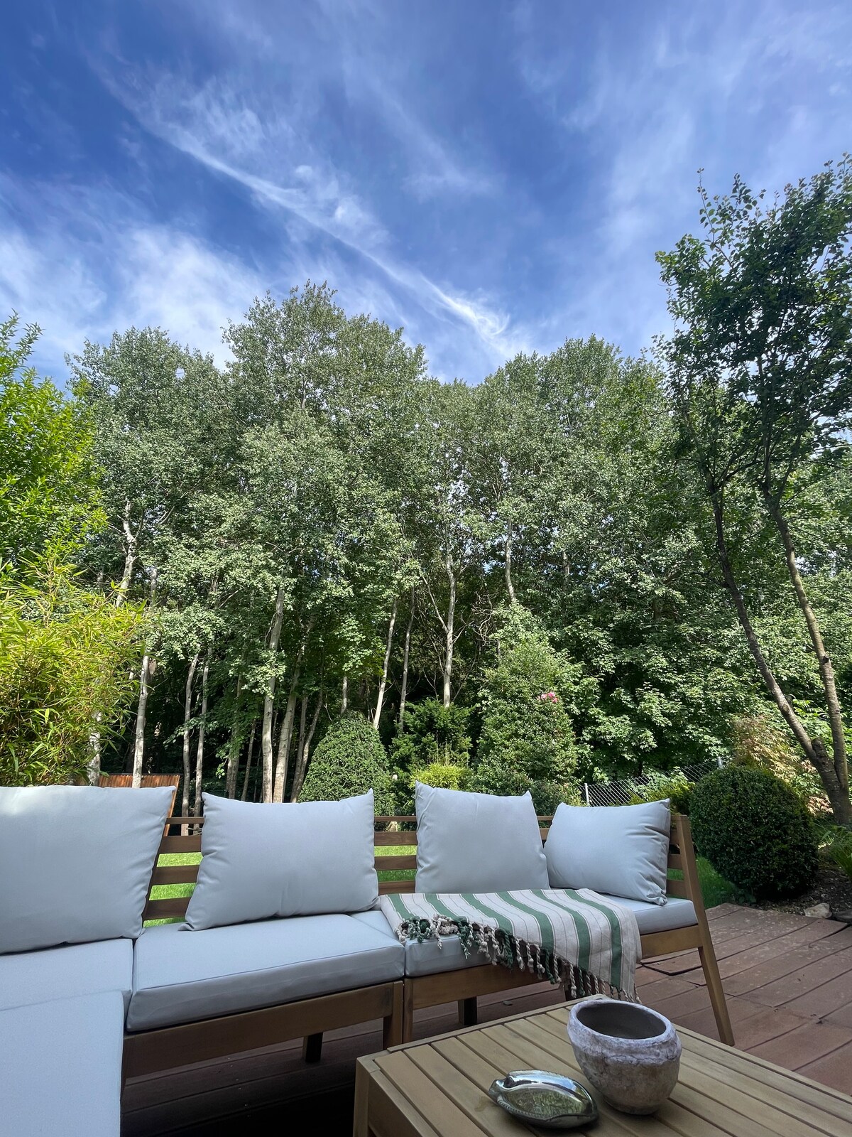 Our “Waldhütte” in the Five Lakes Region/Pfaffenwinkel is perfect for peace and nature – with great access to castles, lakes, mountains, and Munich. Secluded, 200 m from the main house, it offers pure retreat: panoramic views of meadow and forest, a terrace for dining, yoga, or knitting, stargazing from the loft. Inside, a wood stove and infrared heating keep things cozy while foxes and deer pass by outside.
