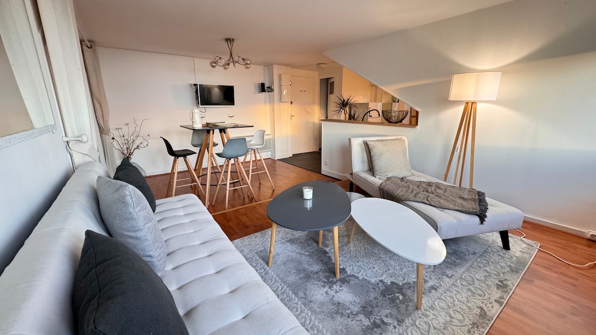 Flat 80 m² yang cerah dan modern ini ideal untuk hingga 5 orang (maksimal 4 orang dewasa). Tempat ini memiliki ruang tamu/makan yang luas dengan TV, dapur lengkap, dua kamar tidur, dan kamar mandi dengan shower berdiri dan toilet terpisah. Seprai dan handuk disediakan. Apartemen ini memiliki balkon dan tempat parkir. Terletak di lantai pertama, 300 meter dari pantai /tepi laut dan 150 meter dari toko — lokasi ideal untuk menjelajahi Royan dengan berjalan kaki. Tempat ini direnovasi pada tahun 2025.