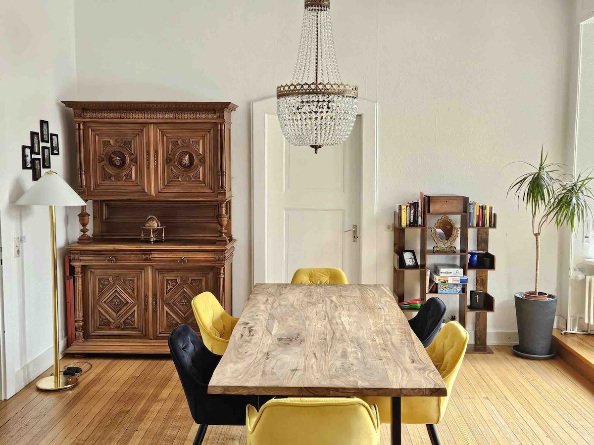 Relax! – in dieser geräumigen und ruhigen Unterkunft. Stilvolle, gepflegte Wohnung mit Balkon für bis zu 2 Personen (Paar) in der ersten Etage (zur alleinigen Nutzung) einer Altbau-Villa . Es ist eine großzügige Wohnung, ruhig und zentral gelegen in gehobener Wohngegend. Ideal für eine Einzelperson oder ein Paar (evtl. mit Kind). Es gibt offene Räume, ein abgeschlossenes Schlafzimmer mit großem Bett (1,80m x 2 m) und zusätzlich ein ausklappbares Schlafsofa (1,40m x 2m) im Wohn-Esszimmer.
