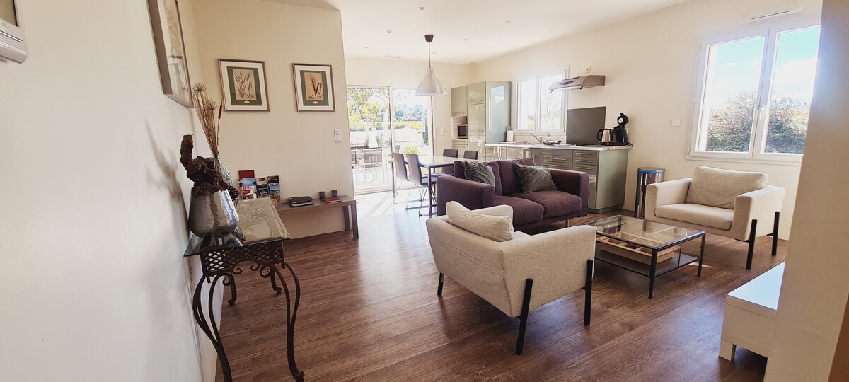 Untuk liburan atau berhenti di jalan menuju Spanyol F1 satu lantai ber - AC 25 m2, berdampingan dengan vila kami dengan pintu masuk independen serta TAMAN PRIBADINYA yang akrab. Mobil Anda akan diparkir di jalan masuk kami (gerbang listrik). Kamar tidur dengan tempat tidur queen 140/200 yang dipisahkan oleh atap kaca, Dapur lengkap (microwave, kompor induksi, dll.) tV lounge with 140/190 sofa bed Kamar mandi (shower) wc. Anda memiliki taman, meja, kursi berjemur, dan plancha listrik.