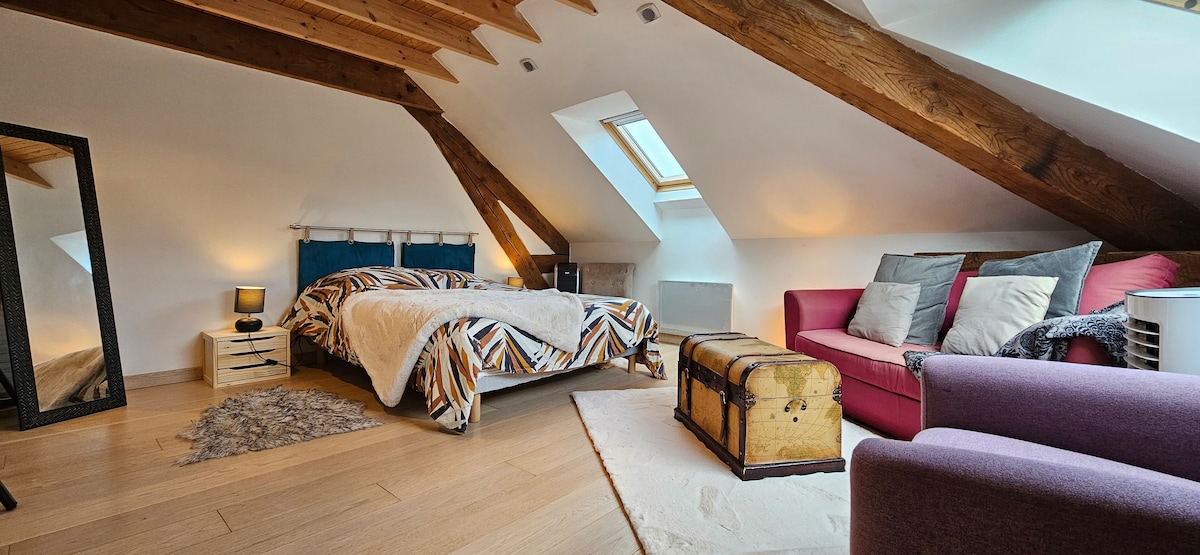 Nikmati suasana menawan studio romantis ini dengan pemandangan terbuka yang indah dari perbukitan Valdaine. Kecil tapi lucu dengan kenyamanan yang menyenangkan. Studio yang benar-benar independen. Seprai dan handuk disediakan. Parkir aman berjarak beberapa lusin meter dari properti, akses ke properti melalui gerbang otomatis. Carrefour Express (cuci baju 24/7) dan minimarket di desa menawan (terklasifikasi) St Geoire en Valdaine