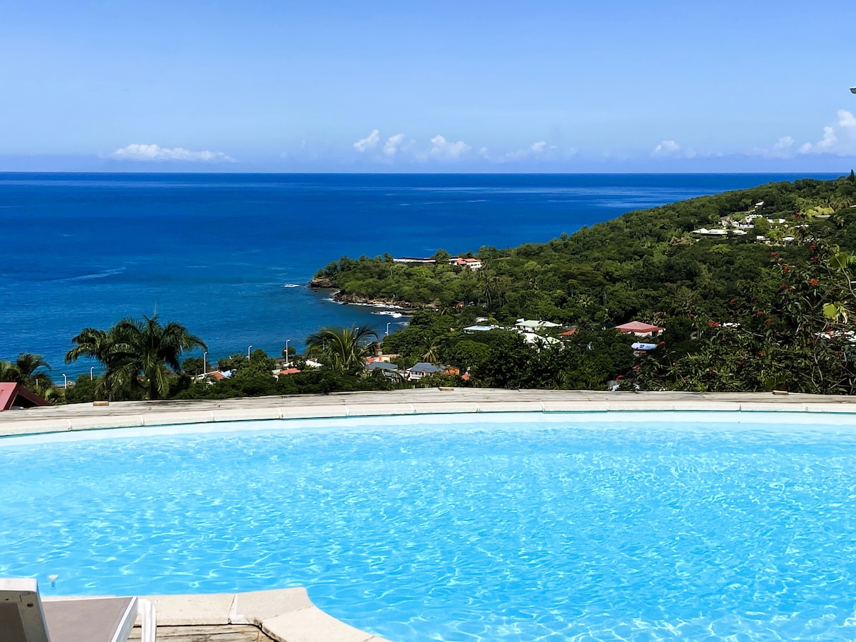 Apartemen yang menawan, nyaman, dengan dekorasi yang halus dan elegan, di lantai 1 vila kami, di lahan berhutan di lingkungan yang tenang, di atas bukit antara laut dan gunung. Pemandangan Teluk Saintes yang menakjubkan. Cocok untuk 4 orang atau pasangan yang memiliki anak - anak. 45 menit dari bandara, 5 menit dari dermaga untuk Les Saintes dan keberangkatan pendakian di belakang layar. 10 menit dari mata air panas Dolé, pantai Grand Anse (pasir hitam). 15 menit dari Le Carbet Falls