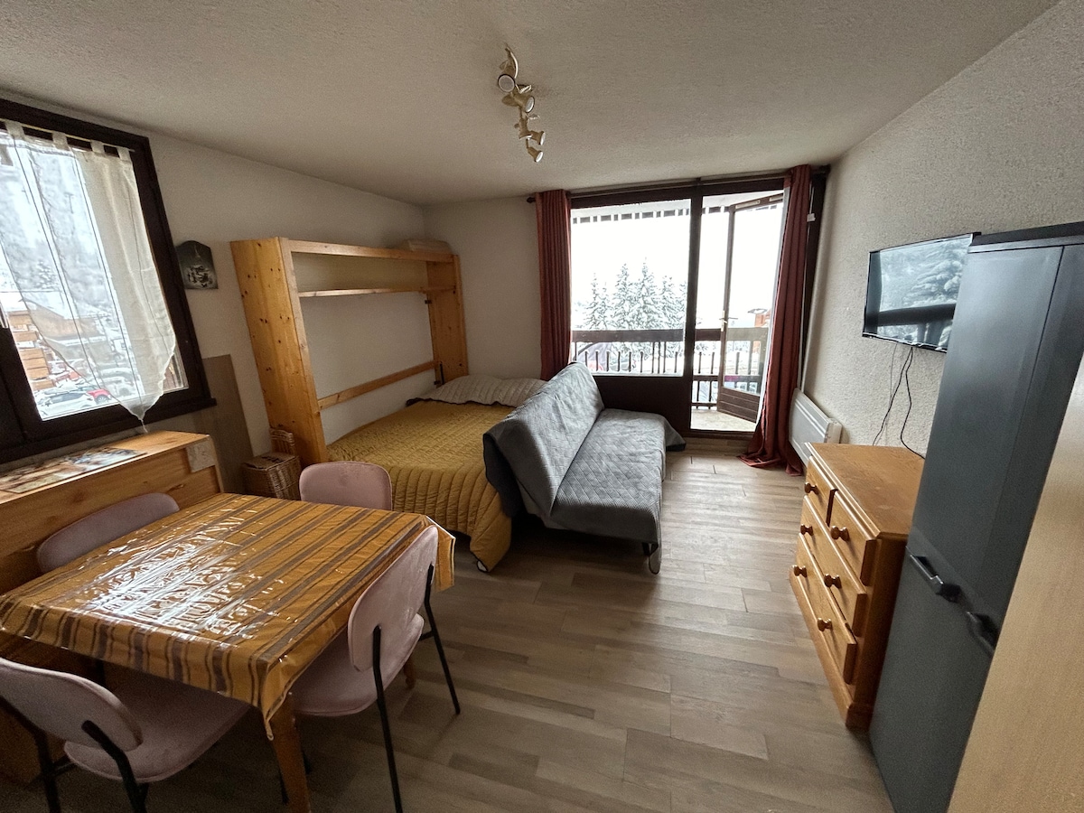 Apartemen 4/6 pers di lantai 4 dengan lift dekat Marquis chairlift Direnovasi Akses ski dan toko (restoran, ESF, toko roti, tiket ski, supermarket) 10 menit jalan kaki ke pusat resor 34m2, ruang makan, kamar mandi, 2 kamar tidur 2 140 bed termasuk 1 sofa bed 1 tempat tidur susun Dapur lengkap ( kompor, microwave, kulkas, mesin cuci piring, raclette, senseo, ketel) loker ski Layanan di lokasi yang memungkinkan: - Layanan Kebersihan € 85 - Seprai tempat tidur kit - Handuk kit