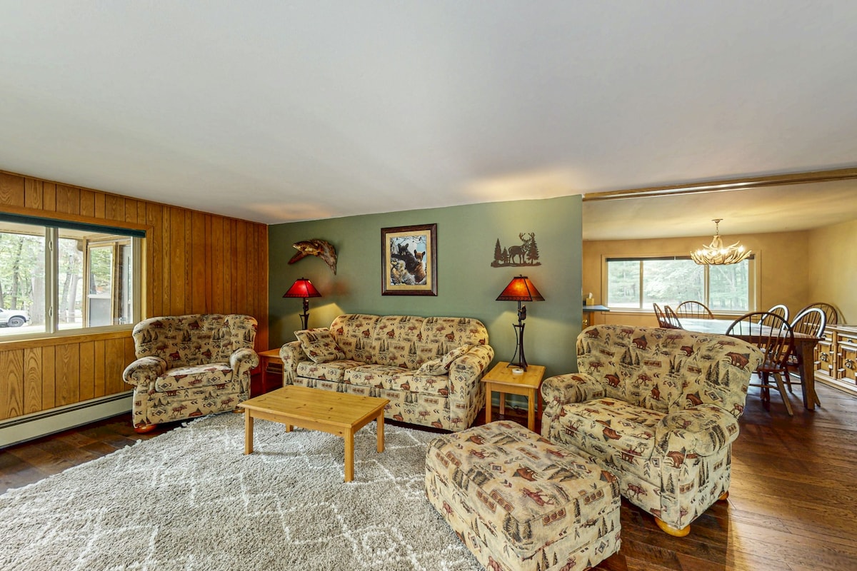 Rumah yang nyaman menampilkan pencahayaan & warna cat yang hangat dan dekorasi Northwood yang kreatif dengan sentuhan modern. Fasilitas termasuk internet berkecepatan tinggi, peralatan stainless, pembuat kopi, mesin cuci dan pengering beban depan, layanan streaming/Apple TV, 3 TV layar datar, 2 perapian , AC sentral, dan tungku efisiensi tinggi. Rumah ini terletak di 4 hektar hutan (bukan tepi danau) dari jalan kerikil yang terawat dengan baik. Sangat pribadi. Tidak ada tetangga yang terlihat. Satwa liar sangat banyak. Anjing baik - baik saja dengan persetujuan & biaya.