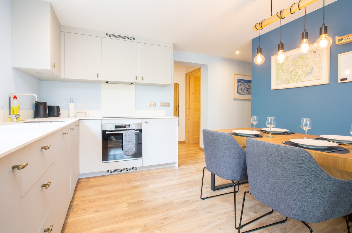 Top floor apartment with large balcony & stunning views! Central yet secluded location. - Master bedroom; super-king bed, Smart TV. - En-suite; corner shower & double ended bath. - Open plan living; inc. 55" smart TV (UK Freesat). - Large sunny balcony overlooking river with panoramic mountain views. - Underfloor heating - Secure storage for skis or bikes - Warm boot store/utility room Everything done to the highest quality to ensure a luxurious stay!
