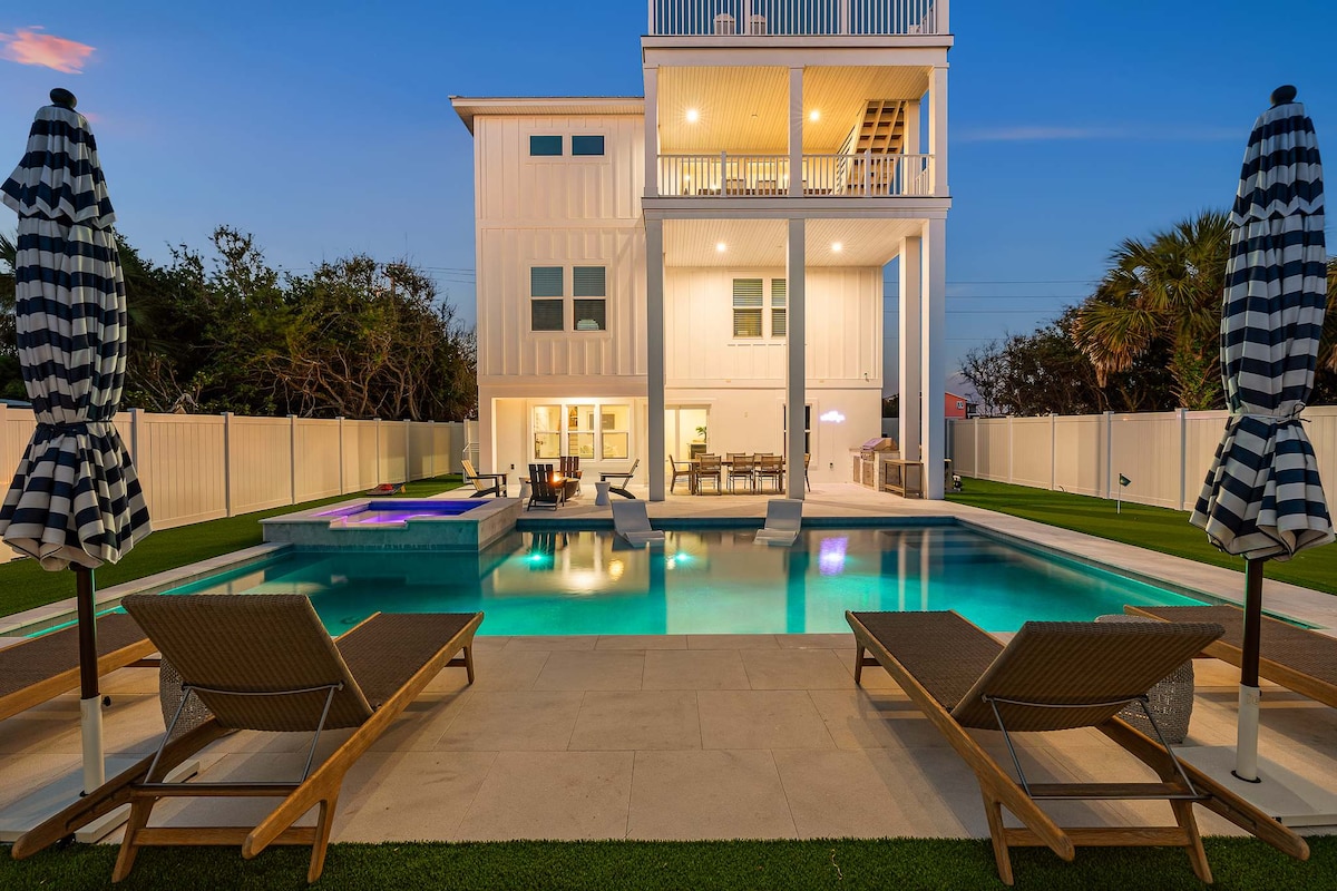 Seaclusion is a luxury, designer home complete with top amenities for endless fun and relaxation. ->Outdoor haven with heated pool/spa, grill, putt putt, firepit and more! ->Pool/Spa Heat Available for $40 per day - Contact for Details ->Roof Deck dining with direct sunrise and sunset views ->Kids dream bunk room ->In- home entertainment including arcade games (Mortal Kombat, Golden Tee, & Pacman), cornhole, and table tennis ->Directly across from beach access ->Elevator for all 3 floors