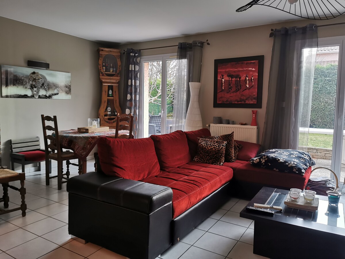 Lantai dasar 90m2 terpisah dari sebuah rumah. Terletak 12 menit dari bandara Saint - Exupéry, 18 menit dari stadion Groupama, 22 menit dari Eurexpo, 20 menit dari LDLC Arena dan 25 menit dari Lyon. Check - in dan check - out mandiri melalui kotak berkunci, ideal untuk check - in terlambat atau check - out lebih Akomodasi ini baru, dilengkapi dengan AC, dan memiliki 3 kamar tidur, dapur yang dilengkapi dengan ruang tamu terbuka, serta teras.