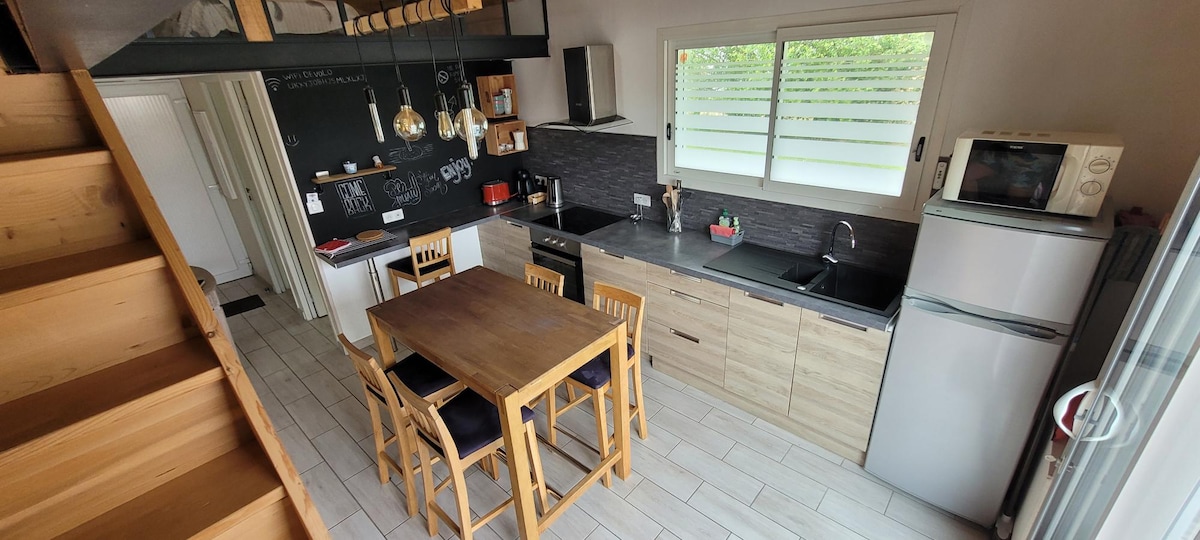Kabin kayu cantik yang dibangun dengan bahan tropis dan eksotis di jantung Andernos - les - Bains, terletak di taman pribadi seluas 400m2 yang tersembunyi dan dikelilingi di lingkungan kehutanan. Kabin ini terletak dekat dengan Arcachon Bay (5 menit berkendara), 30 menit berkendara dari Cap Ferret, 3 menit dari Bordeaux Mérignac dan hanya berjarak 8 menit bersepeda dari pusat kota. Dekat dengan rute sepeda yang tak ada habisnya.