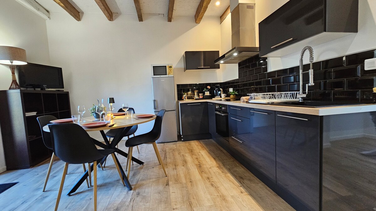 Appartement neuf, lumineux avec une chambre sur mezzanine. (avec escalier raide). Un séjour avec une cuisine ouverte, toute équipée (four, lave-vaisselle, frigo, micro-onde, cafetière Senseo, bouilloire). Le logement peut accueillir jusqu'à 4 personnes max, car il y a un lit en 160 et un clic-clac d'appoint dans le séjour. Nous serons ravis de vous accueillir dans cet appartement attenant à notre maison. Quartier résidentiel calme. Vous pourrez ainsi découvrir notre belle région.
