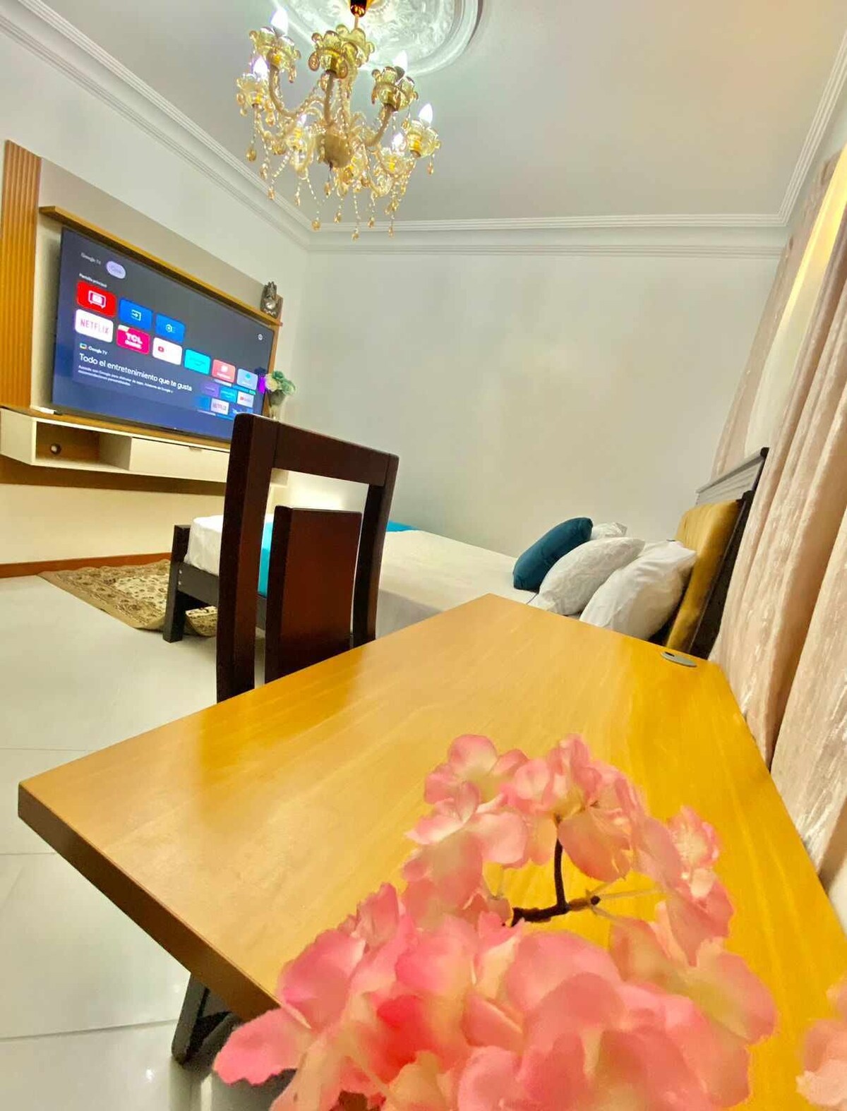 Ubicada en un condominio seguro, esta suite ofrece una experiencia única con una decoración moderna que incluye un columpio de rosas y chimenea decorativa. Con cocina totalmente equipada, área de trabajo, Wi-Fi, es perfecta para turistas, nómadas digitales, parejas y viajeros de negocios. Ubicada sobre una avenida principal, frente a un mall con tiendas y restaurantes, a solo minutos del aeropuerto, terminal de buses y centro turístico. Disfruta de recepción 24/7 y servicio de lavandería.
