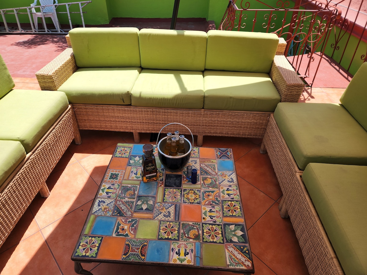 Casita adalah wisma tamu yang nyaman dan diperbarui (dengan AC/panas, air terfilter/UV) dari properti perumahan. Tempat ini memiliki dek atap yang indah dengan pemandangan gunung dan Danau. Casita 2 kamar tidur, 2 kamar mandi memiliki halaman tropis pribadinya sendiri di dalam perumahan berdinding yang indah dan aman. Terletak dalam beberapa blok dari berbagai fasilitas Ajijic. Parkir yang aman dan ditunjuk di dalam dinding properti. Lapangan tenis/acar, kolam renang BERPEMANAS. Saya seorang realtor, jadi beri tahu aku kalau kamu punya pertanyaan Real Estate. Edit