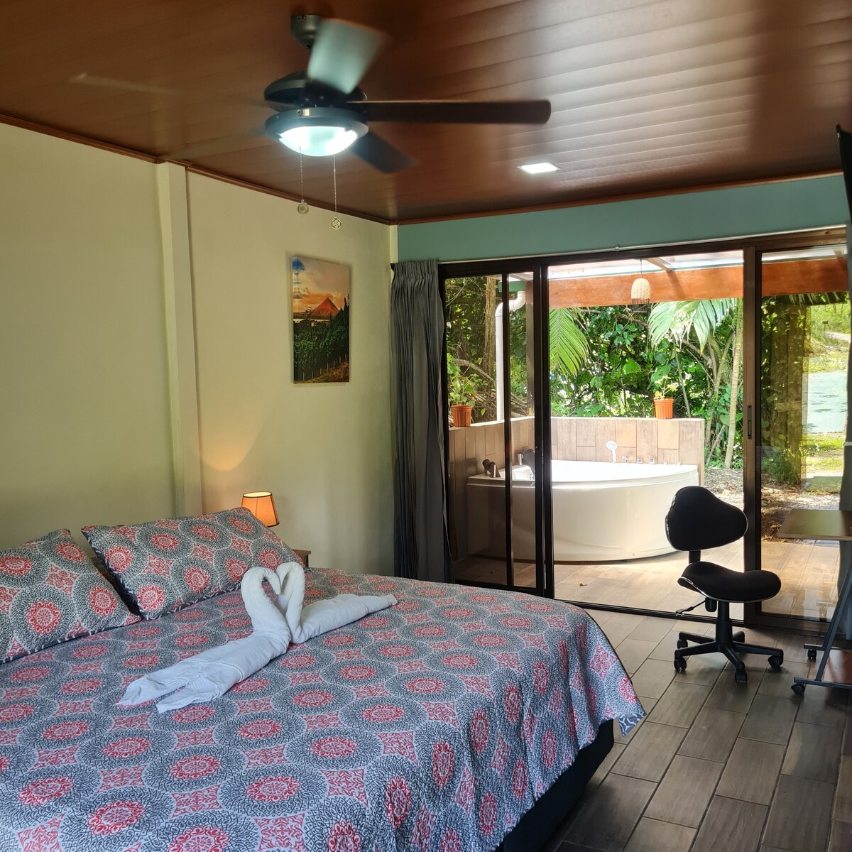 Kamar nyaman dengan tempat tidur king dan jacuzzi luar ruangan pribadi, ideal untuk pasangan. Terletak di El Castillo, dekat dengan restoran, pasar swalayan, dan aktivitas utama La Fortuna: sumber air panas, Danau Arenal, Taman Nasional, tur kanopi, dan banyak lagi. Pemandangan Gunung Berapi Arenal dari pintu masuk, dan suara sungai yang menenangkan dari jacuzzi. Sangat cocok untuk bersantai setelah seharian berpetualang.