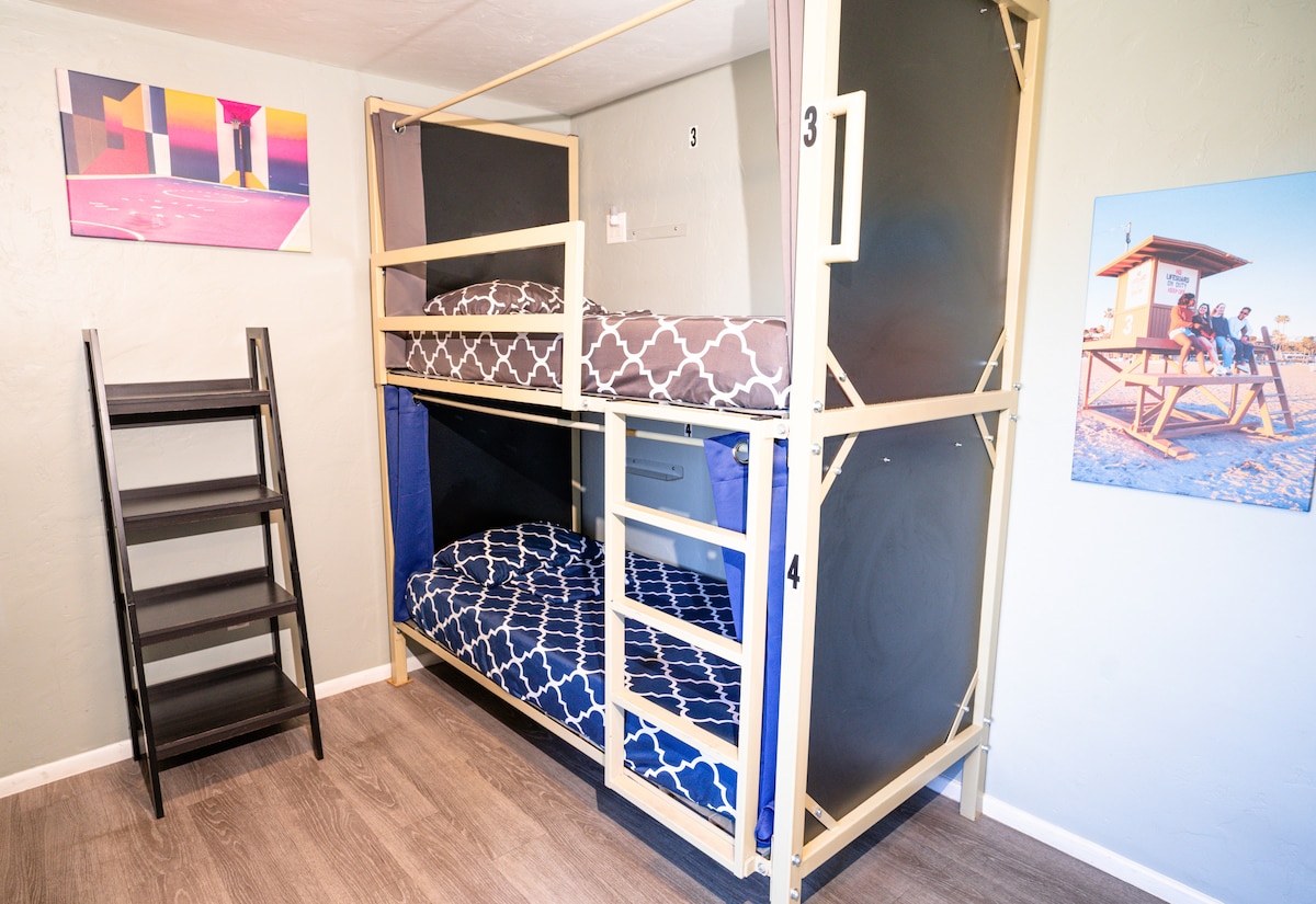 Sangat cocok untuk rombongan yang ingin menjelajahi area pantai San Diego! Datang dan nikmati Tempat Tidur di Kamar Asrama Campuran di Beach Bungalow Surf Hostel di Pacific Beach, San Diego. Kami berlokasi di depan laut dan menawarkan aktivitas gratis setiap hari, sarapan gratis, handuk, dapur umum, penatu, parkir berbayar, dan penggunaan barang pantai & WiFi gratis. Papan selancar dan sewa setelan jas basah di resepsi kami. Iklan ini untuk 1 tamu di asrama wanita 8 tempat tidur kami. Sayangnya, kami tidak menerima warga San Diego County.