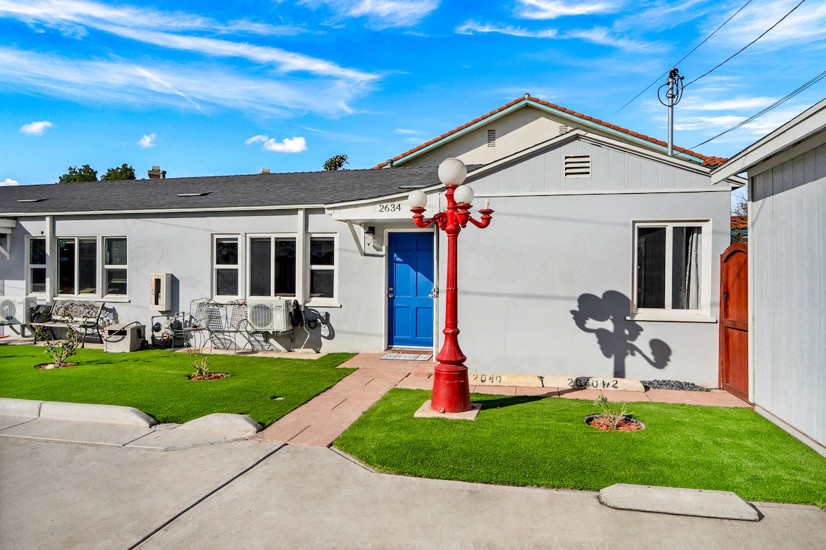 Bungalo seniman ramah hewan peliharaan di lokasi paling keren. Perpaduan antara yang lama & baru, Blanca Bungalow adalah area seluas 600+ kaki persegi yang nyaman dengan area luar ruangan untuk memaksimalkan masa inap Anda di San Diego. Seprai berkualitas tinggi, dapur lengkap, dan perlengkapan seni untuk memicu kreativitas Anda. 1 blok dari restoran, pub, dan toko yang luar biasa, (bahkan target mini). 5 menit berkendara ke pusat kota, Balboa Park, Golf, dan Kebun Binatang. South Park adalah surga Pup: taman anjing lokal yang LUAS & banyak restoran memiliki patio yang ramah anjing.