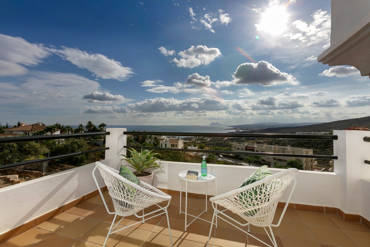 Penthouse yang luas ini menawarkan pemandangan menakjubkan ke arah Mediterania, Gibraltar, dan Afrika, serta teras pribadi seluas 40 m². Terletak di komunitas yang tenang dan berpagar dengan akses kolam renang sepanjang tahun—baik kolam renang luar ruangan maupun kolam renang dalam ruangan yang jarang dipanaskan—tempat ini adalah tempat sempurna untuk bersantai. Di dalam: Wi-Fi cepat, Smart TV 75", dapur lengkap, 4 kamar tidur bergaya, dan 3 kamar mandi modern.